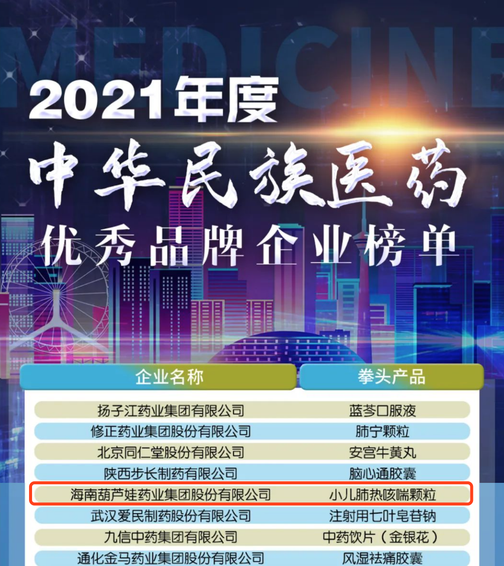 12月29日,全国工商联医药业商会发布了“2021年度中华民族医药优秀品牌企业榜单”,mg冰球突破药业集团凭借黄金单品小儿肺热咳喘颗粒(4克)实力登榜。